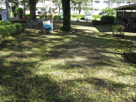 ●2011年9月22日野分(のわき)の翌朝、地面いっぱいの落ち葉。通勤の時、撮影しました。キンモクセイの花も満開の時、台風がくると、ちょっと悲しいです。