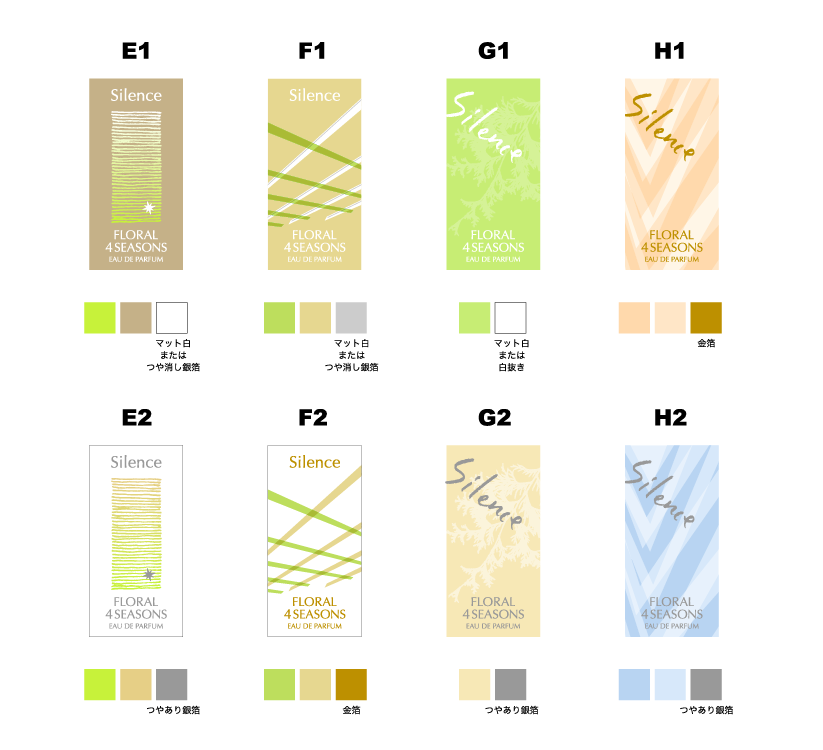 ・香りのコンセプトからするとE1でしょうか。大きめな文字や、直線的なラインは静寂なイメージから遠ざかる気がします。