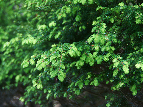 コメツガはモミの木に似た日本固有の針葉樹林。亜高山帯の山岳地帯に分布し、やせた土地や土の少ない岩肌でも逞しく成長し巨木となります。コメツガは多くの針葉樹林同様、しゃがれて剥がれかけた固い樹皮が人を寄せ付けない厳しさを見せますが、コメツガの森林を満たす空気の清涼感と透明感は秀逸です。