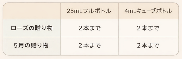 ※「ローズの贈り物」「5月の贈り物」は数量限定商品です。お一人家族様それぞれ「累計2本まで」にご協力ください
